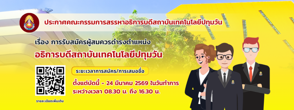 การสรรหาอธิการบดี 2569 ประกาศคณะกรรมการสรรหาผู้สมควรดำรงตำแหน่งอธิการบดีสถาบันเทคโนโลยีปทุมวัน เรื่อง การรับสมัครผู้สมควรดำรงตำแหน่งอธิการบดีสถาบันเทคโนโลยีปทุมวัน ประกาศรับสมัครผู้สมควรดำรงตำแหน่งอธิการบดีสถาบันเทคโนโลยีปทุมวัน แบบ คสผ.01 PDF – ใบเสนอชื่อ สรรหาอธิการบดี แบบ คสผ.01 Word – ใบเสนอชื่อ สรรหาอธิการบดี แบบ คสผ.02 PDF – ใบสมัครอธิการบดี แบบ คสผ.02 Word – ใบสมัครอธิการบดี
